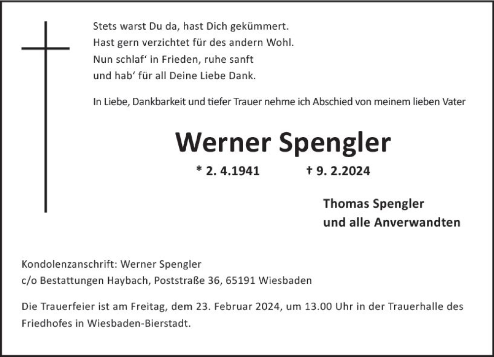 Hier finden Sie alle Traueranzeigen aus der Zeitung, die bisher für Werner Spengler erschienen sind. Weitere Traueranzeigen, die in der Zeitung erscheinen, werden hier ebenfalls aufgelistet