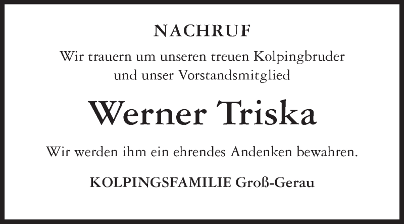 Hier finden Sie alle Traueranzeigen aus der Zeitung, die bisher für Werner Triska erschienen sind. Weitere Traueranzeigen, die in der Zeitung erscheinen, werden hier ebenfalls aufgelistet