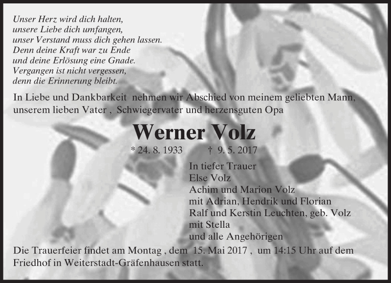 Hier finden Sie alle Traueranzeigen aus der Zeitung, die bisher für Werner Volz erschienen sind. Weitere Traueranzeigen, die in der Zeitung erscheinen, werden hier ebenfalls aufgelistet