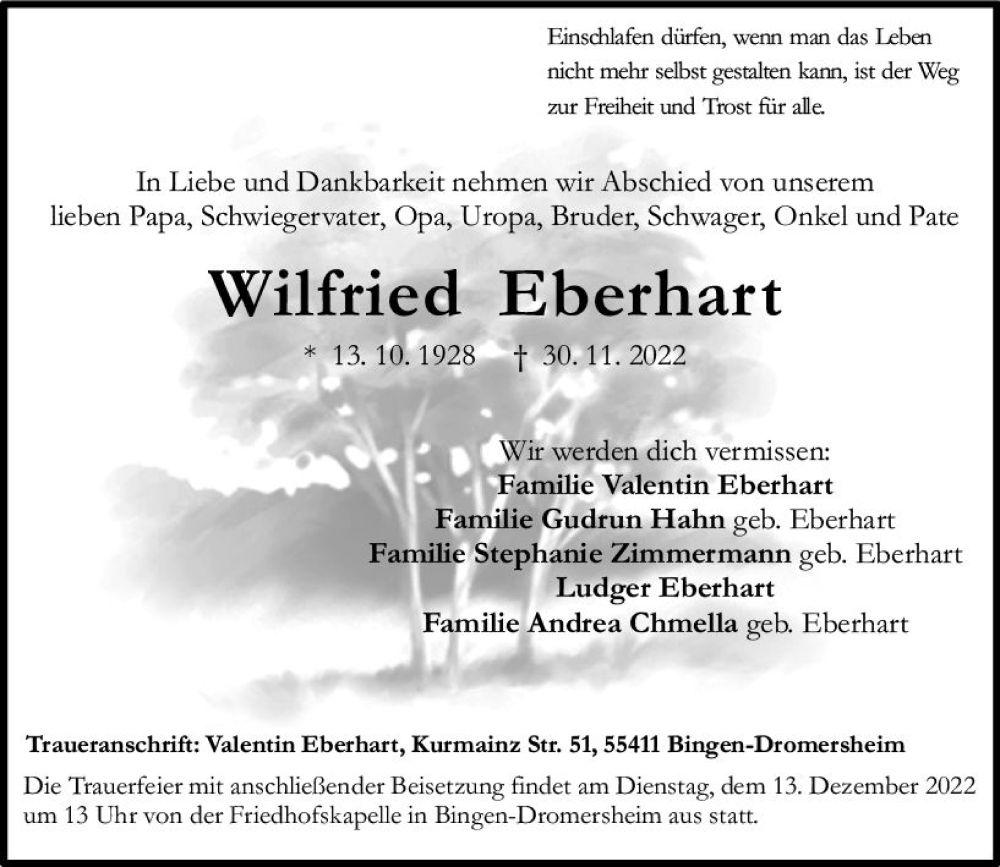 Hier finden Sie alle Traueranzeigen aus der Zeitung, die bisher für Wilfried Eberhart erschienen sind. Weitere Traueranzeigen, die in der Zeitung erscheinen, werden hier ebenfalls aufgelistet