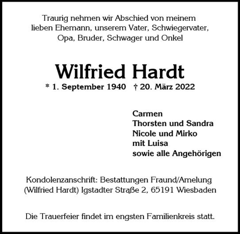 Hier finden Sie alle Traueranzeigen aus der Zeitung, die bisher für Wilfried Hardt erschienen sind. Weitere Traueranzeigen, die in der Zeitung erscheinen, werden hier ebenfalls aufgelistet