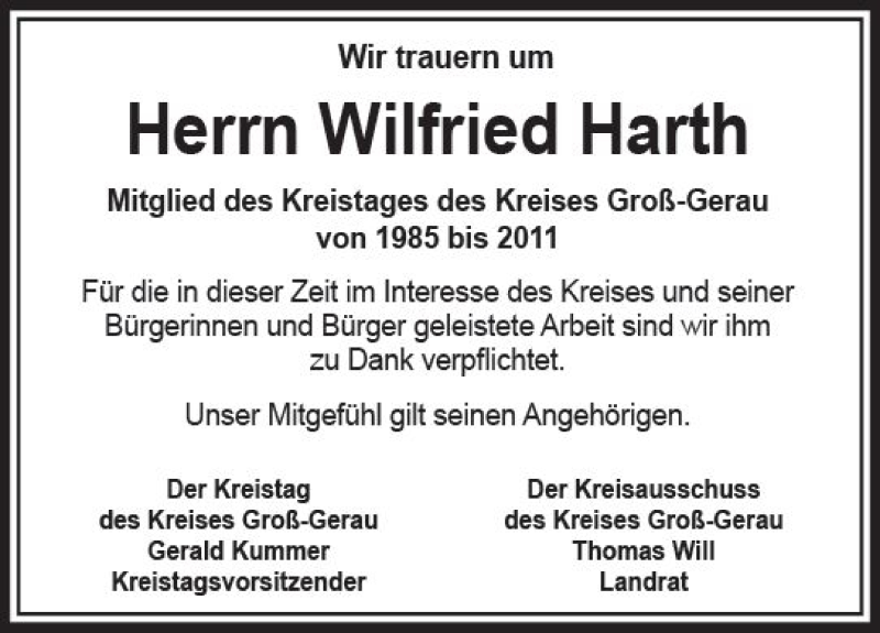 Hier finden Sie alle Traueranzeigen aus der Zeitung, die bisher für Wilfried Harth erschienen sind. Weitere Traueranzeigen, die in der Zeitung erscheinen, werden hier ebenfalls aufgelistet