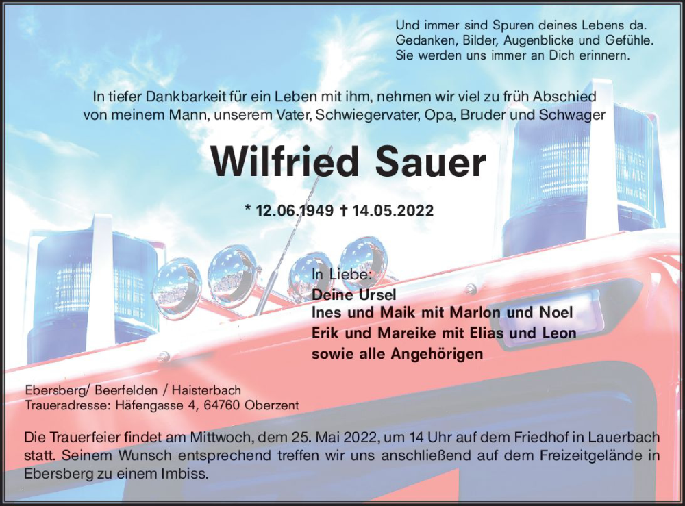 Hier finden Sie alle Traueranzeigen aus der Zeitung, die bisher für Wilfried Sauer erschienen sind. Weitere Traueranzeigen, die in der Zeitung erscheinen, werden hier ebenfalls aufgelistet