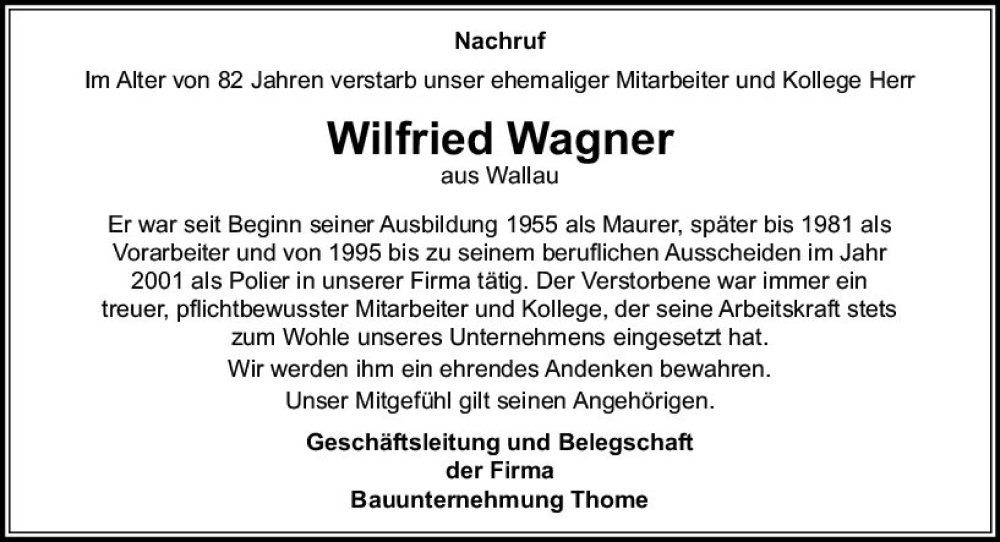 Hier finden Sie alle Traueranzeigen aus der Zeitung, die bisher für Wilfried Wagner erschienen sind. Weitere Traueranzeigen, die in der Zeitung erscheinen, werden hier ebenfalls aufgelistet