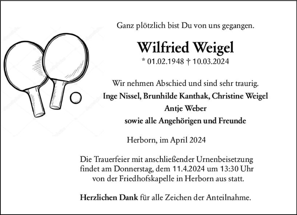 Hier finden Sie alle Traueranzeigen aus der Zeitung, die bisher für Wilfried Weigel erschienen sind. Weitere Traueranzeigen, die in der Zeitung erscheinen, werden hier ebenfalls aufgelistet