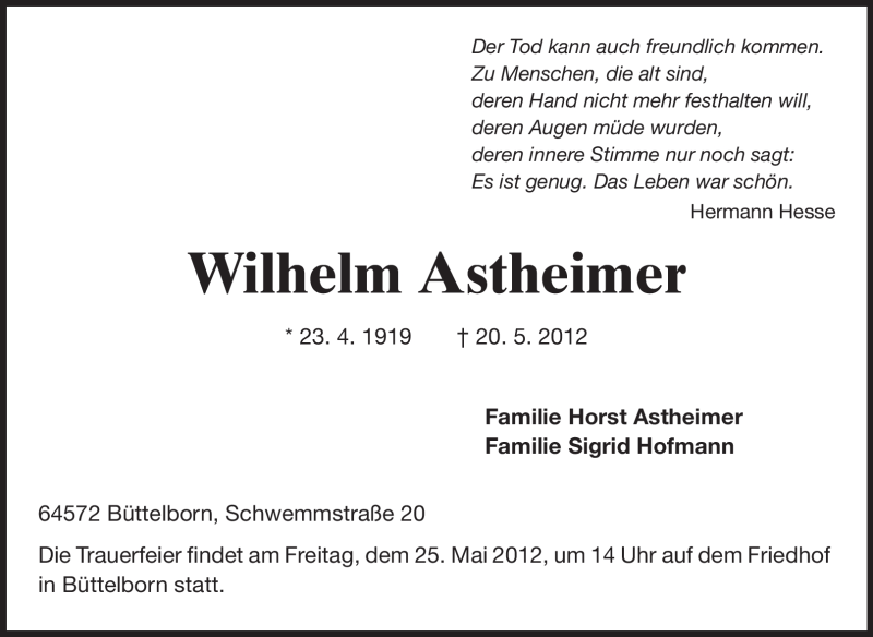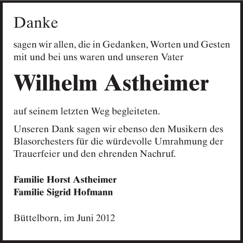Hier finden Sie alle Traueranzeigen aus der Zeitung, die bisher für Wilhelm Astheimer erschienen sind. Weitere Traueranzeigen, die in der Zeitung erscheinen, werden hier ebenfalls aufgelistet