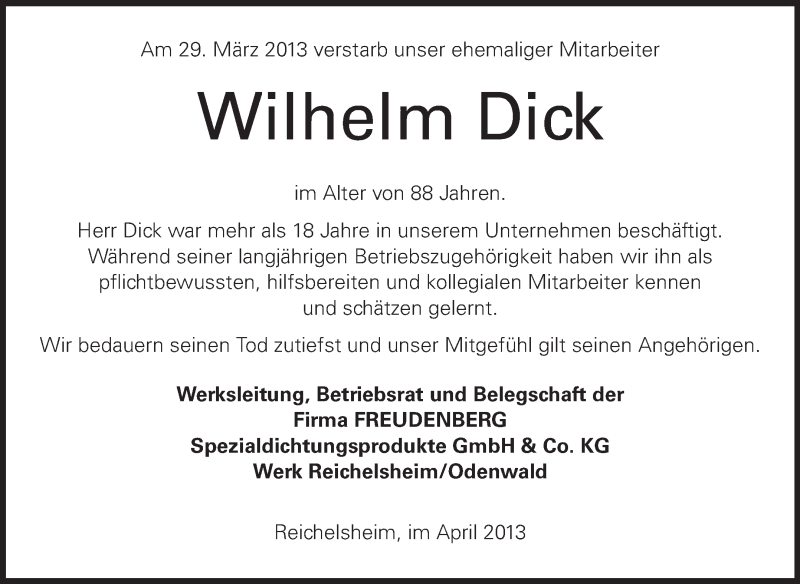 Hier finden Sie alle Traueranzeigen aus der Zeitung, die bisher für Wilhelm Dick erschienen sind. Weitere Traueranzeigen, die in der Zeitung erscheinen, werden hier ebenfalls aufgelistet