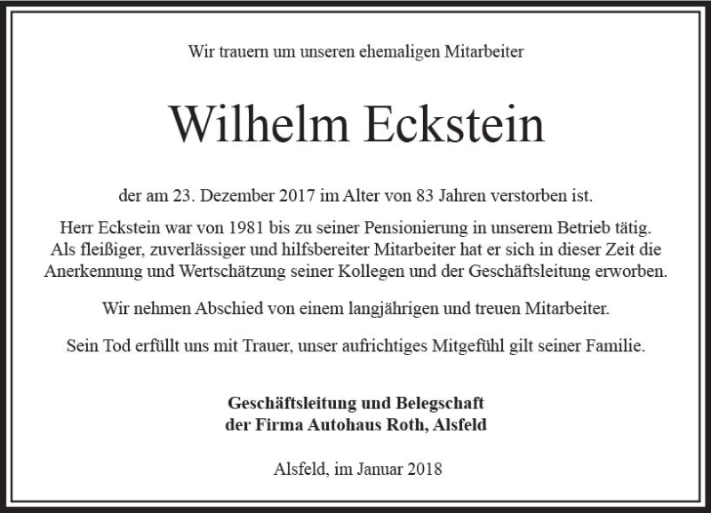 Hier finden Sie alle Traueranzeigen aus der Zeitung, die bisher für Wilhelm Eckstein erschienen sind. Weitere Traueranzeigen, die in der Zeitung erscheinen, werden hier ebenfalls aufgelistet