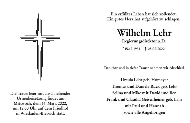 Hier finden Sie alle Traueranzeigen aus der Zeitung, die bisher für Wilhelm Lehr erschienen sind. Weitere Traueranzeigen, die in der Zeitung erscheinen, werden hier ebenfalls aufgelistet