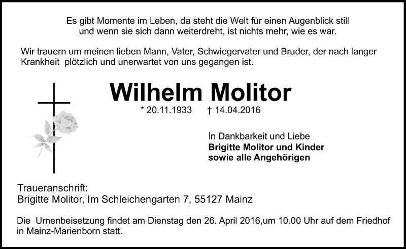 Hier finden Sie alle Traueranzeigen aus der Zeitung, die bisher für Wilhelm Molitor erschienen sind. Weitere Traueranzeigen, die in der Zeitung erscheinen, werden hier ebenfalls aufgelistet