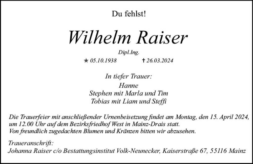 Hier finden Sie alle Traueranzeigen aus der Zeitung, die bisher für Wilhelm Raiser erschienen sind. Weitere Traueranzeigen, die in der Zeitung erscheinen, werden hier ebenfalls aufgelistet