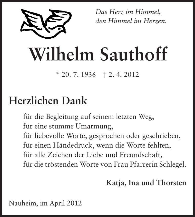 Hier finden Sie alle Traueranzeigen aus der Zeitung, die bisher für Wilhelm Sauthoff erschienen sind. Weitere Traueranzeigen, die in der Zeitung erscheinen, werden hier ebenfalls aufgelistet