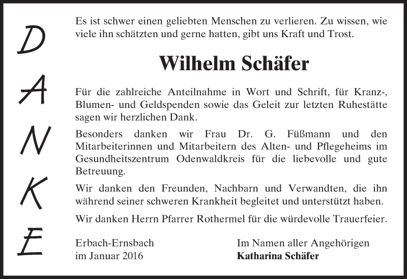 Hier finden Sie alle Traueranzeigen aus der Zeitung, die bisher für Wilhelm Schäfer erschienen sind. Weitere Traueranzeigen, die in der Zeitung erscheinen, werden hier ebenfalls aufgelistet