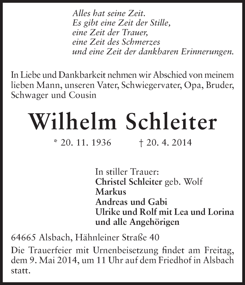 Hier finden Sie alle Traueranzeigen aus der Zeitung, die bisher für Wilhelm Schleiter erschienen sind. Weitere Traueranzeigen, die in der Zeitung erscheinen, werden hier ebenfalls aufgelistet