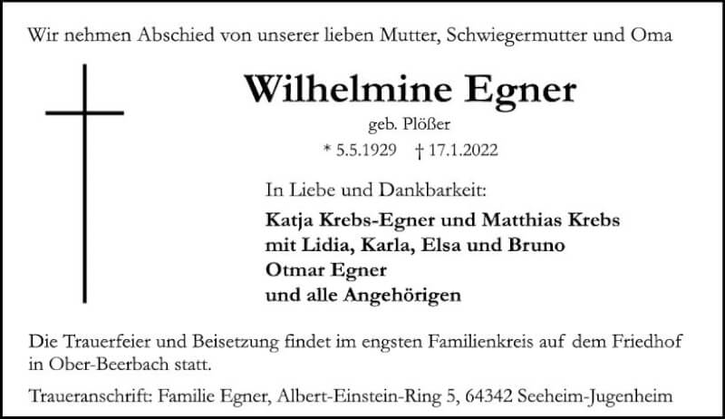 Hier finden Sie alle Traueranzeigen aus der Zeitung, die bisher für Wilhelmine Egner erschienen sind. Weitere Traueranzeigen, die in der Zeitung erscheinen, werden hier ebenfalls aufgelistet