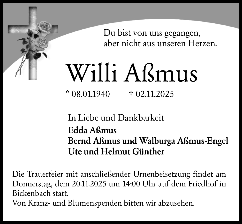 Hier finden Sie alle Traueranzeigen aus der Zeitung, die bisher für Willi Aßmus erschienen sind. Weitere Traueranzeigen, die in der Zeitung erscheinen, werden hier ebenfalls aufgelistet