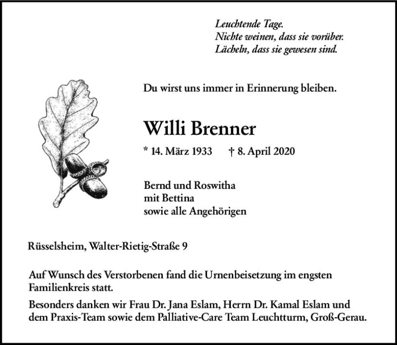 Hier finden Sie alle Traueranzeigen aus der Zeitung, die bisher für Willi Brenner erschienen sind. Weitere Traueranzeigen, die in der Zeitung erscheinen, werden hier ebenfalls aufgelistet