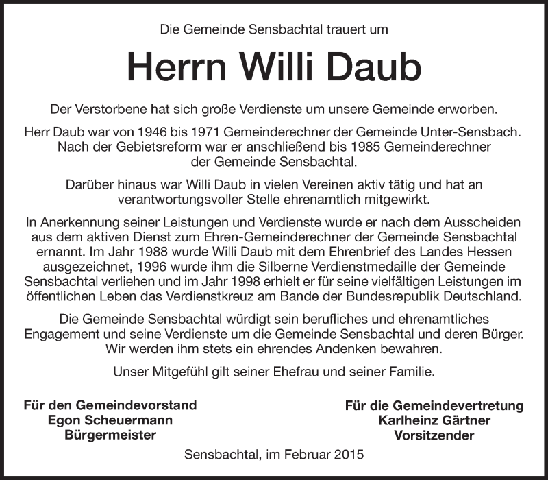 Hier finden Sie alle Traueranzeigen aus der Zeitung, die bisher für Willi Daub erschienen sind. Weitere Traueranzeigen, die in der Zeitung erscheinen, werden hier ebenfalls aufgelistet