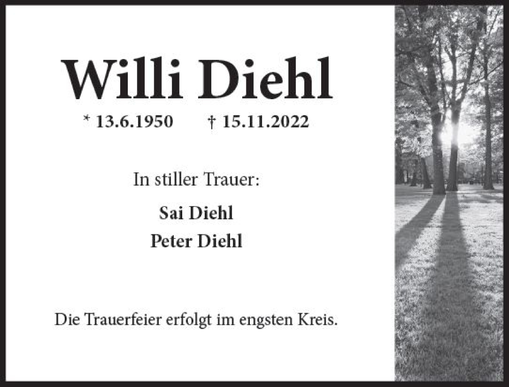 Hier finden Sie alle Traueranzeigen aus der Zeitung, die bisher für Willi Diehl erschienen sind. Weitere Traueranzeigen, die in der Zeitung erscheinen, werden hier ebenfalls aufgelistet