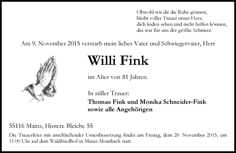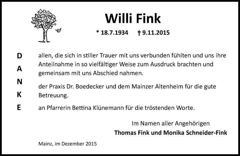 Hier finden Sie alle Traueranzeigen aus der Zeitung, die bisher für Willi Fink erschienen sind. Weitere Traueranzeigen, die in der Zeitung erscheinen, werden hier ebenfalls aufgelistet