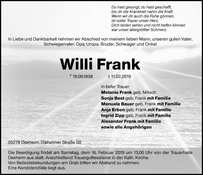 Hier finden Sie alle Traueranzeigen aus der Zeitung, die bisher für Willi Frank erschienen sind. Weitere Traueranzeigen, die in der Zeitung erscheinen, werden hier ebenfalls aufgelistet