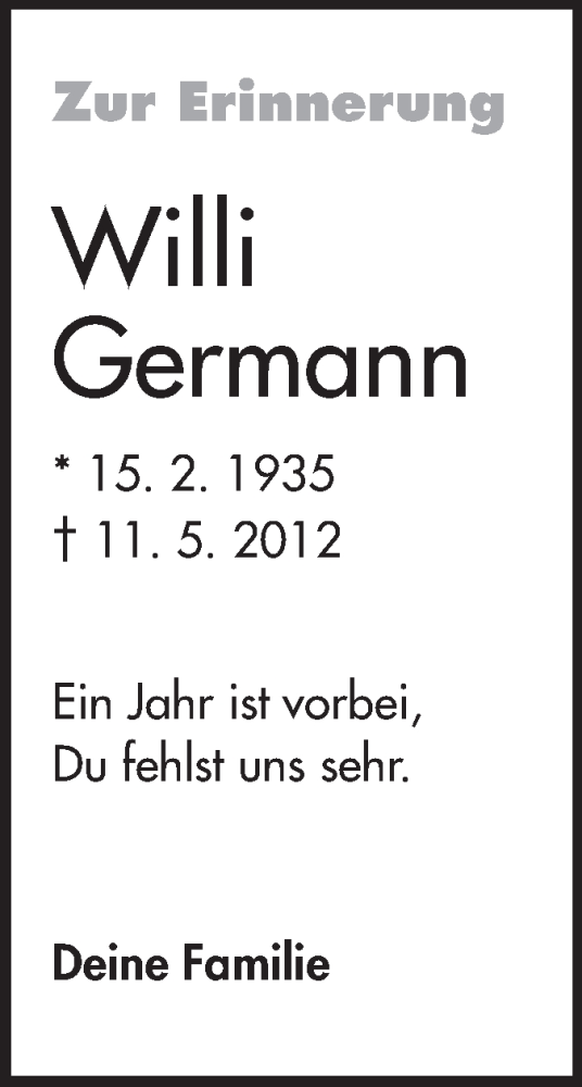 Hier finden Sie alle Traueranzeigen aus der Zeitung, die bisher für Willi Germann erschienen sind. Weitere Traueranzeigen, die in der Zeitung erscheinen, werden hier ebenfalls aufgelistet
