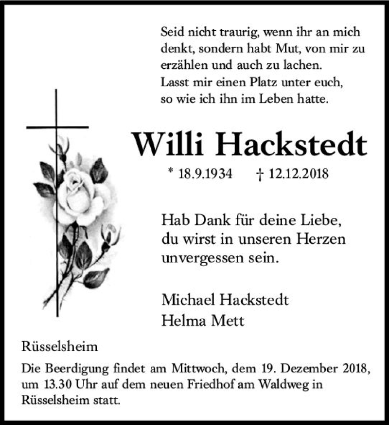 Hier finden Sie alle Traueranzeigen aus der Zeitung, die bisher für Willi Hackstedt erschienen sind. Weitere Traueranzeigen, die in der Zeitung erscheinen, werden hier ebenfalls aufgelistet