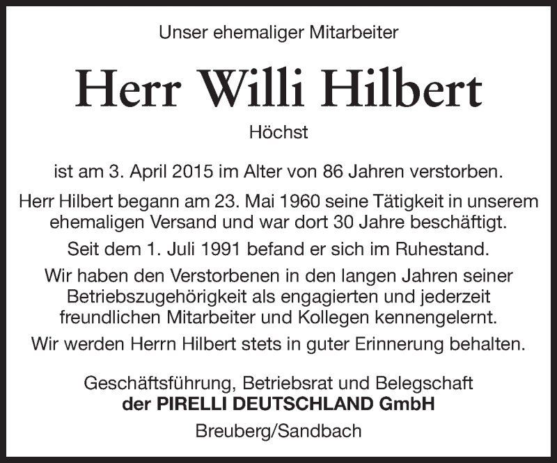 Hier finden Sie alle Traueranzeigen aus der Zeitung, die bisher für Willi Hilbert erschienen sind. Weitere Traueranzeigen, die in der Zeitung erscheinen, werden hier ebenfalls aufgelistet