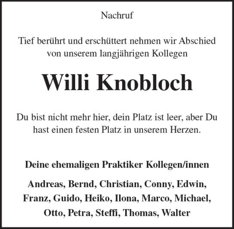 Hier finden Sie alle Traueranzeigen aus der Zeitung, die bisher für Willi Knobloch erschienen sind. Weitere Traueranzeigen, die in der Zeitung erscheinen, werden hier ebenfalls aufgelistet
