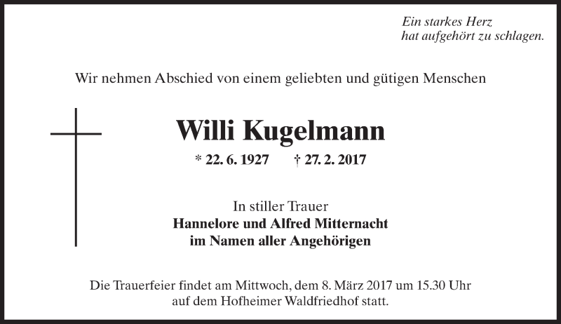 Hier finden Sie alle Traueranzeigen aus der Zeitung, die bisher für Willi Kugelmann erschienen sind. Weitere Traueranzeigen, die in der Zeitung erscheinen, werden hier ebenfalls aufgelistet