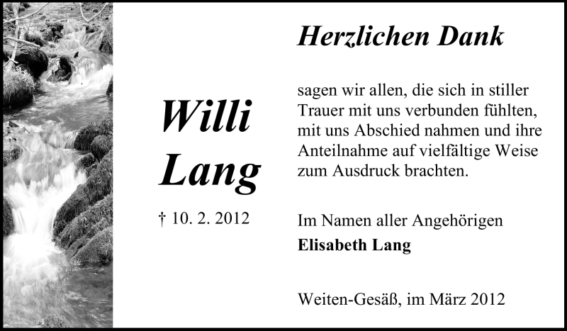 Hier finden Sie alle Traueranzeigen aus der Zeitung, die bisher für Willi Lang erschienen sind. Weitere Traueranzeigen, die in der Zeitung erscheinen, werden hier ebenfalls aufgelistet