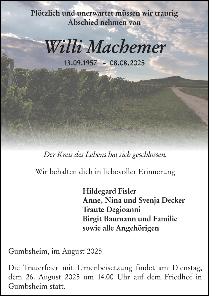 Hier finden Sie alle Traueranzeigen aus der Zeitung, die bisher für Willi Machemer erschienen sind. Weitere Traueranzeigen, die in der Zeitung erscheinen, werden hier ebenfalls aufgelistet