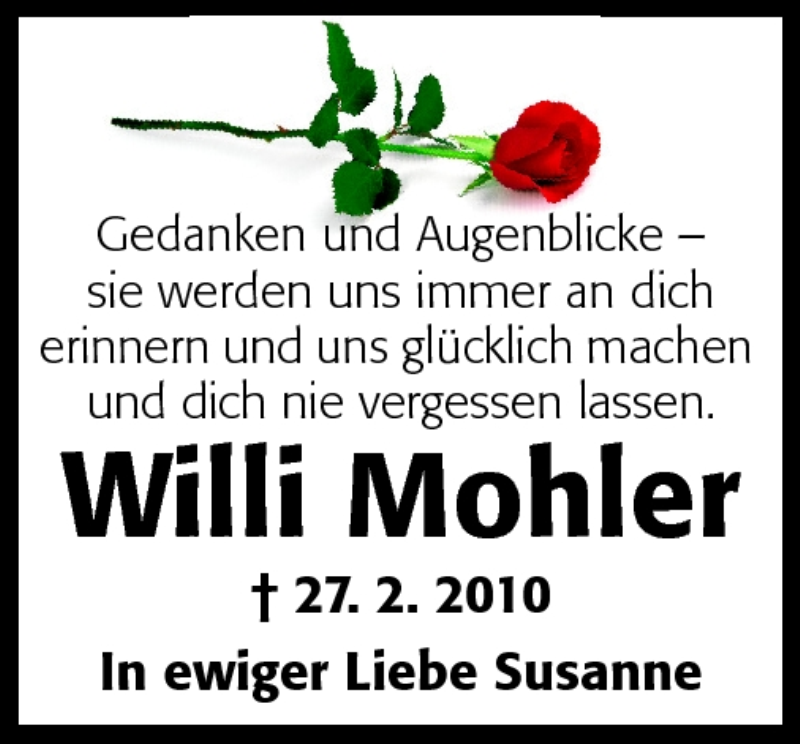 Hier finden Sie alle Traueranzeigen aus der Zeitung, die bisher für Willi Mohler erschienen sind. Weitere Traueranzeigen, die in der Zeitung erscheinen, werden hier ebenfalls aufgelistet