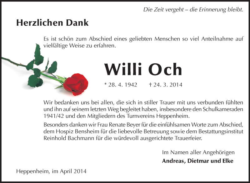 Hier finden Sie alle Traueranzeigen aus der Zeitung, die bisher für Willi Och erschienen sind. Weitere Traueranzeigen, die in der Zeitung erscheinen, werden hier ebenfalls aufgelistet