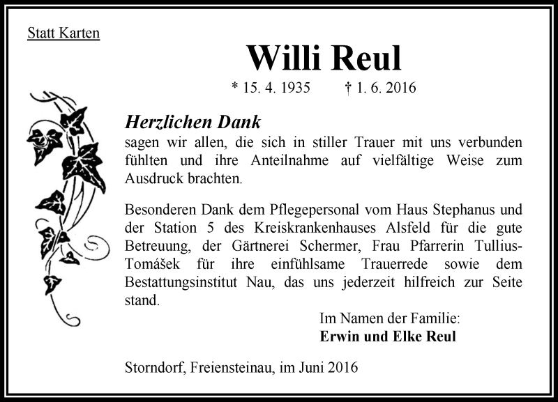 Hier finden Sie alle Traueranzeigen aus der Zeitung, die bisher für Willi Reul erschienen sind. Weitere Traueranzeigen, die in der Zeitung erscheinen, werden hier ebenfalls aufgelistet