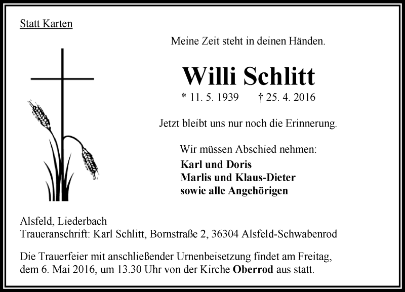 Hier finden Sie alle Traueranzeigen aus der Zeitung, die bisher für Willi Schlitt erschienen sind. Weitere Traueranzeigen, die in der Zeitung erscheinen, werden hier ebenfalls aufgelistet