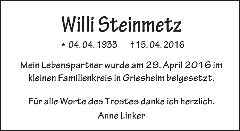 Hier finden Sie alle Traueranzeigen aus der Zeitung, die bisher für Willi Steinmetz erschienen sind. Weitere Traueranzeigen, die in der Zeitung erscheinen, werden hier ebenfalls aufgelistet