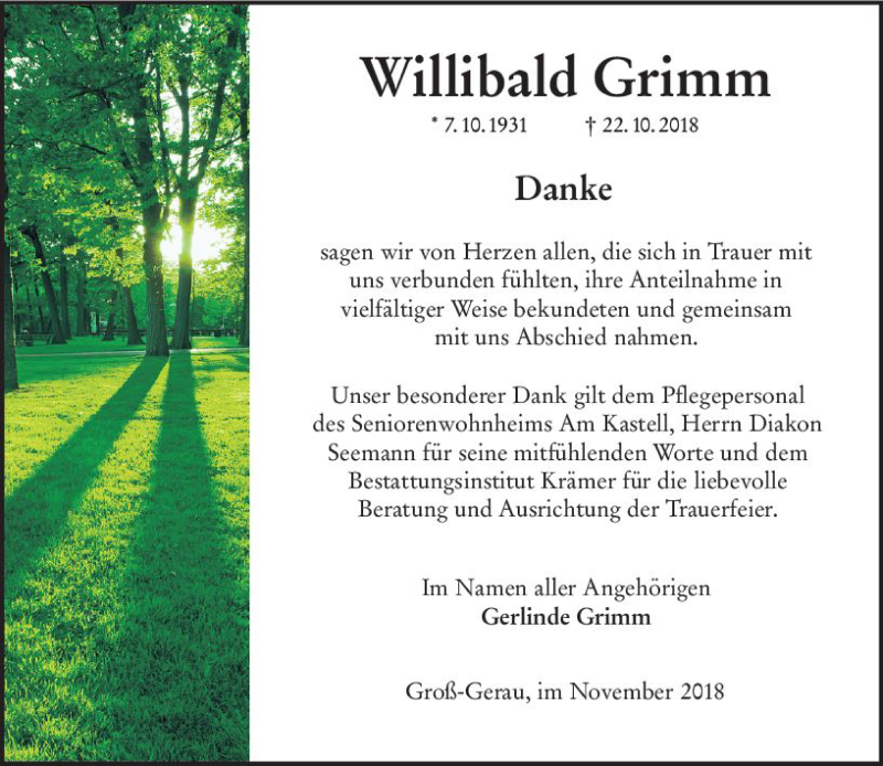 Hier finden Sie alle Traueranzeigen aus der Zeitung, die bisher für Willibald Grimm erschienen sind. Weitere Traueranzeigen, die in der Zeitung erscheinen, werden hier ebenfalls aufgelistet