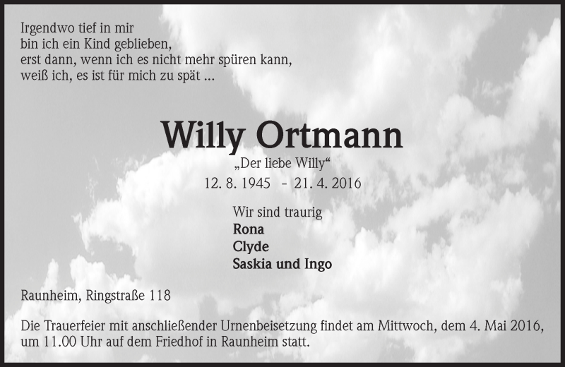 Hier finden Sie alle Traueranzeigen aus der Zeitung, die bisher für Willy Ortmann erschienen sind. Weitere Traueranzeigen, die in der Zeitung erscheinen, werden hier ebenfalls aufgelistet