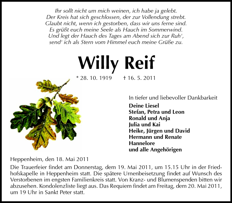 Hier finden Sie alle Traueranzeigen aus der Zeitung, die bisher für Willy Reif erschienen sind. Weitere Traueranzeigen, die in der Zeitung erscheinen, werden hier ebenfalls aufgelistet