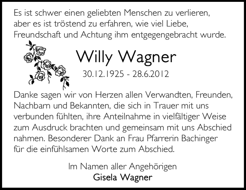 Hier finden Sie alle Traueranzeigen aus der Zeitung, die bisher für Willy Wagner erschienen sind. Weitere Traueranzeigen, die in der Zeitung erscheinen, werden hier ebenfalls aufgelistet
