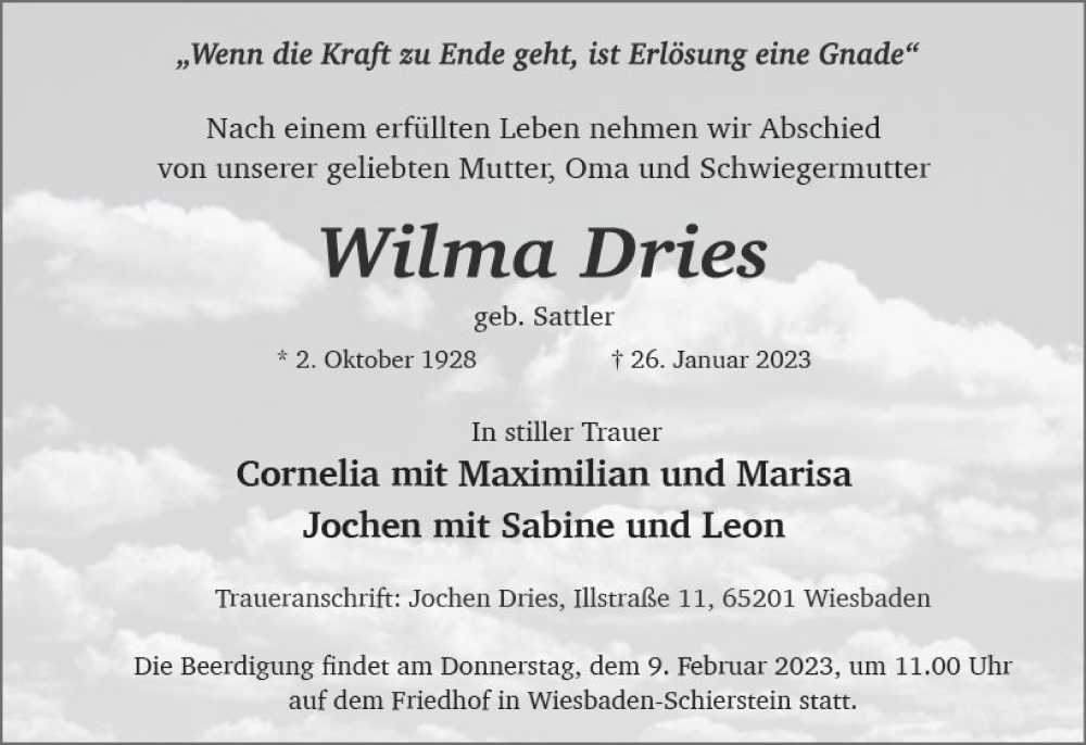 Hier finden Sie alle Traueranzeigen aus der Zeitung, die bisher für Wilma Dries erschienen sind. Weitere Traueranzeigen, die in der Zeitung erscheinen, werden hier ebenfalls aufgelistet