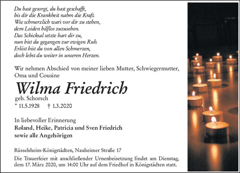 Hier finden Sie alle Traueranzeigen aus der Zeitung, die bisher für Wilma Friedrich erschienen sind. Weitere Traueranzeigen, die in der Zeitung erscheinen, werden hier ebenfalls aufgelistet