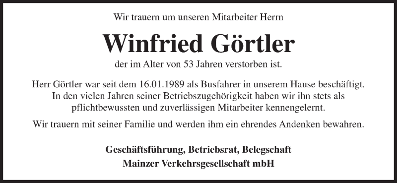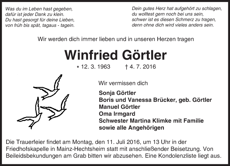 Hier finden Sie alle Traueranzeigen aus der Zeitung, die bisher für Winfried Görtler erschienen sind. Weitere Traueranzeigen, die in der Zeitung erscheinen, werden hier ebenfalls aufgelistet