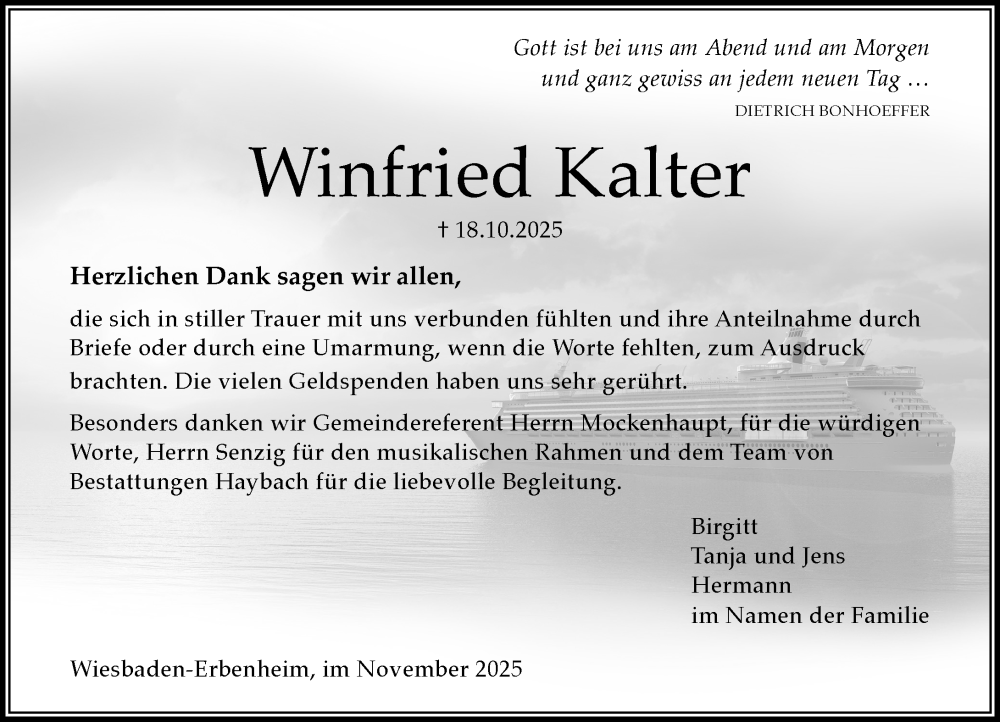 Hier finden Sie alle Traueranzeigen aus der Zeitung, die bisher für Winfried Kalter erschienen sind. Weitere Traueranzeigen, die in der Zeitung erscheinen, werden hier ebenfalls aufgelistet