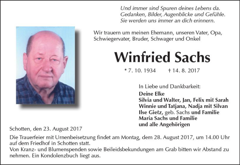 Hier finden Sie alle Traueranzeigen aus der Zeitung, die bisher für Winfried Sachs erschienen sind. Weitere Traueranzeigen, die in der Zeitung erscheinen, werden hier ebenfalls aufgelistet