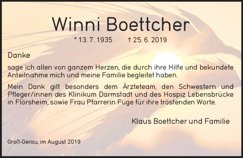 Hier finden Sie alle Traueranzeigen aus der Zeitung, die bisher für Winni Boettcher erschienen sind. Weitere Traueranzeigen, die in der Zeitung erscheinen, werden hier ebenfalls aufgelistet