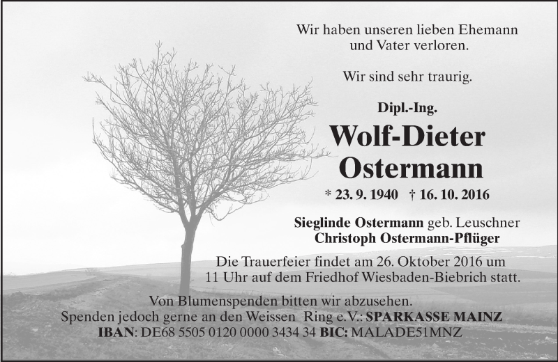 Hier finden Sie alle Traueranzeigen aus der Zeitung, die bisher für Wolf-Dieter Ostermann erschienen sind. Weitere Traueranzeigen, die in der Zeitung erscheinen, werden hier ebenfalls aufgelistet