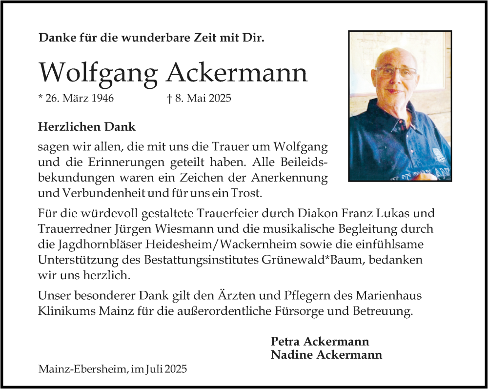 Hier finden Sie alle Traueranzeigen aus der Zeitung, die bisher für Wolfgang Ackermann erschienen sind. Weitere Traueranzeigen, die in der Zeitung erscheinen, werden hier ebenfalls aufgelistet