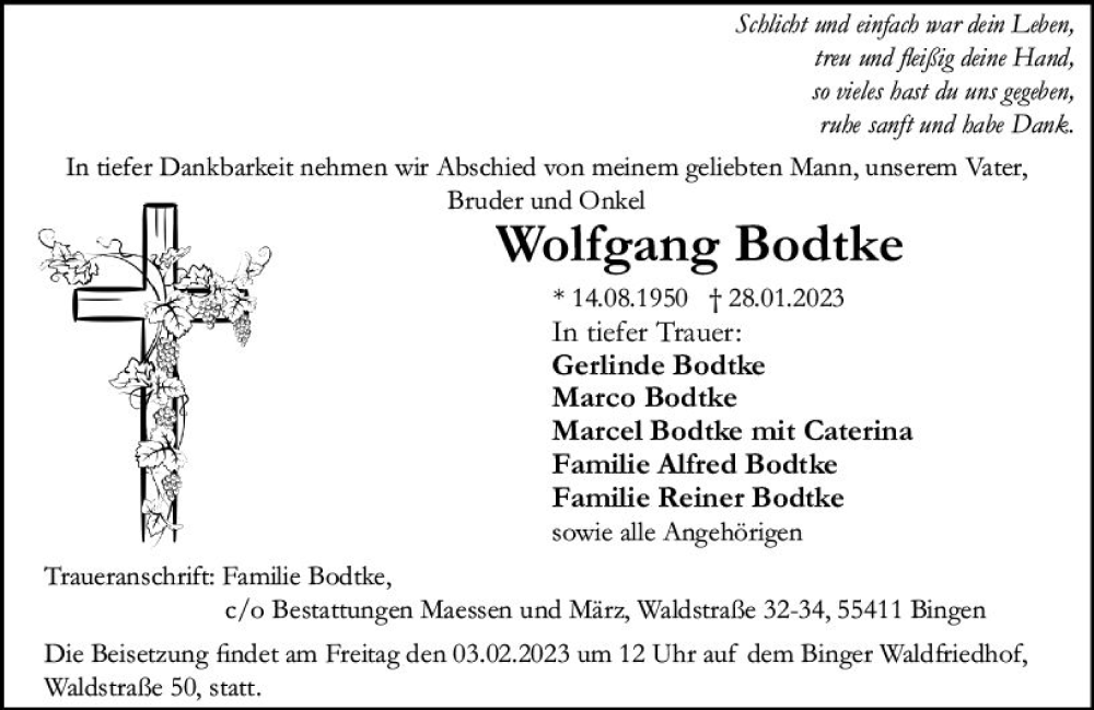 Hier finden Sie alle Traueranzeigen aus der Zeitung, die bisher für Wolfgang Bodtke erschienen sind. Weitere Traueranzeigen, die in der Zeitung erscheinen, werden hier ebenfalls aufgelistet